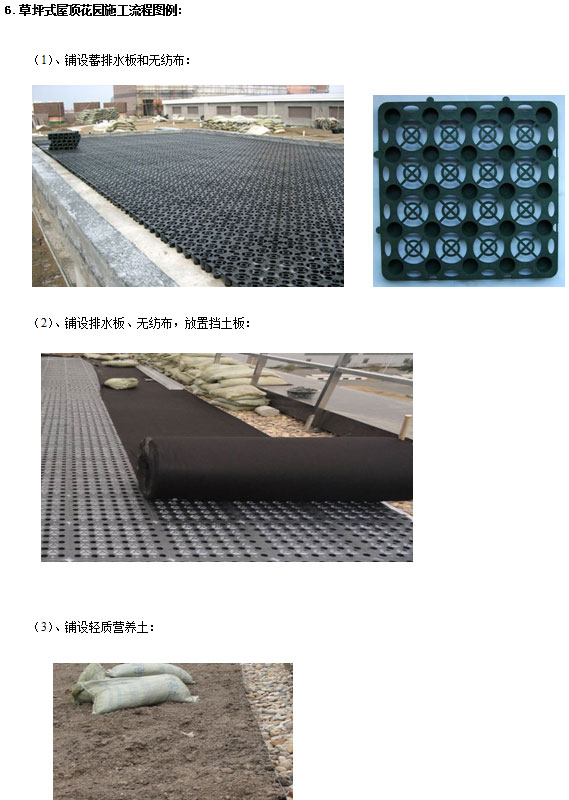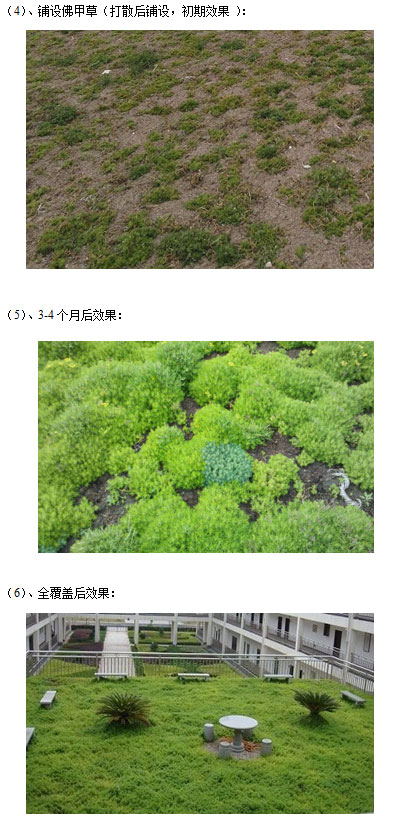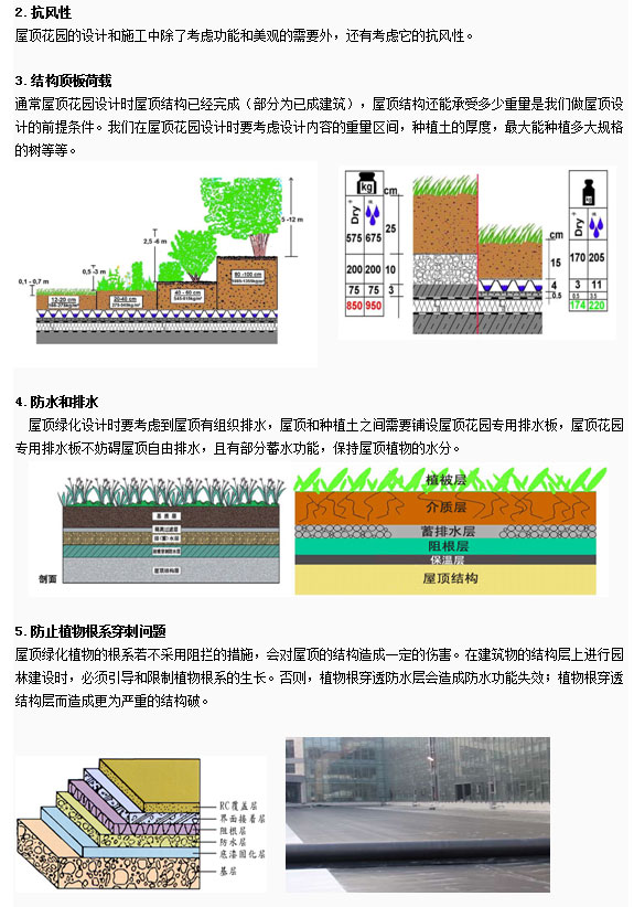 植物種類宜選擇姿態(tài)優(yōu)美、矮小、淺根、抗風(fēng)力強(qiáng)的花灌木、小喬木、球根花卉和多年生花卉。由于多年生木本植物根系對防水層穿透力很強(qiáng),因此,應(yīng)根據(jù)覆土厚度來確定種植植物品種。覆土厚100cm可植小喬木;厚70cm可植灌木;若覆土50cm厚,可以栽種低矮的小灌木,如薔薇科、牡丹、金銀藤、夾竹桃、小石榴樹等;若覆土厚30cm,宜選擇冬枯夏榮的一年生草本植物,如草花、藥材、蔬菜。 屋頂綠化部分常用植物介紹: (1)、佛甲草:作為屋頂綠化常用植物的特性 屬景天科,景天屬,多肉類植物. 耐陰、耐寒、耐旱、耐瘠、易養(yǎng)護(hù):能抗夏季60c高溫,到冬季零下10c能存活,由于其基質(zhì)輕,澆水少,對大部分平頂屋面能應(yīng)用,施工靈活。