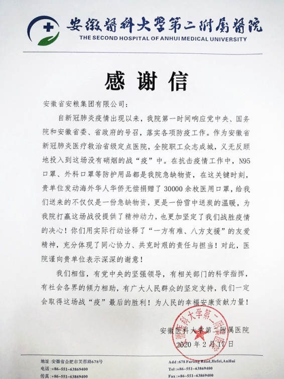 據(jù)悉,安糧集團(tuán)聯(lián)合陳明祥先生另行籌集的3萬只醫(yī)用口罩,近日已定向捐贈安徽醫(yī)科大學(xué)第二附屬醫(yī)院。