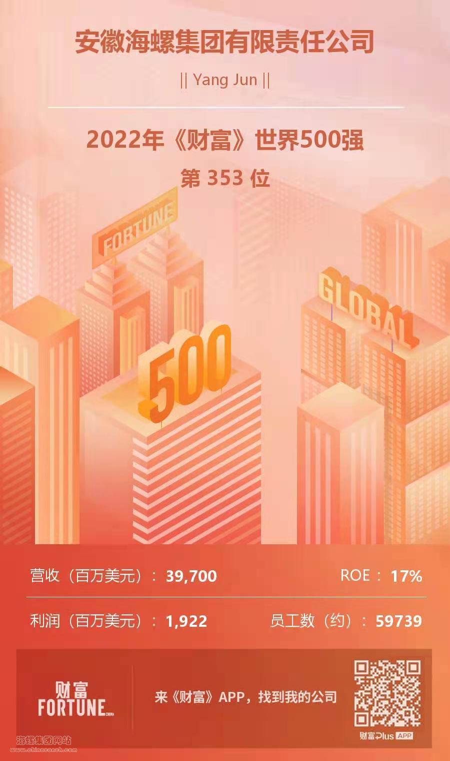 2022年8月3日,《財富》雜志公布“2022年世界500強(qiáng)企業(yè)”排名榜單,海螺集團(tuán)以39,700百萬美元的營業(yè)收入位居第353位,連續(xù)4年進(jìn)入世界500強(qiáng)。