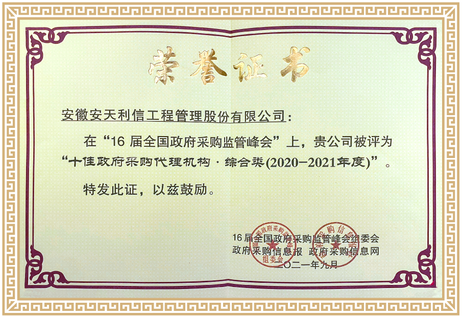 近日,第16屆全國(guó)政府采購監(jiān)管峰會(huì)于??谂e行。本次峰會(huì)公布了2021年度全國(guó)政府采購評(píng)獎(jiǎng)結(jié)果,安徽安天利信工程管理股份有限公司憑借雄厚的專業(yè)實(shí)力獲得“全國(guó)十佳政府采購代理機(jī)構(gòu)”殊榮。