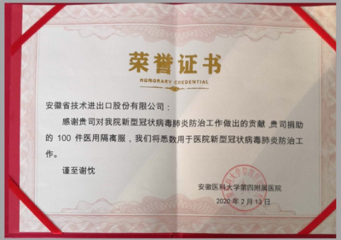 2月13日,安徽省技術(shù)進出口股份有限公司籌集采購的100件醫(yī)用隔離服,順利捐贈安徽醫(yī)科大學(xué)第四附屬醫(yī)院,用于該院奮戰(zhàn)在新冠肺炎疫情防治一線的醫(yī)護人員。